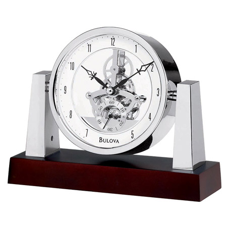 This large skeleton dial table clock from Bulova has a solid hardwood base with dark mahogany stain, a mirror-chrome-finished pivoting clock housing, and supports. It features skeleton movement with a remote second-hand subdial, a protective glass lens, and an engraving plate. Requires one AA battery (not included). Measures 3.25” x 0.75”.