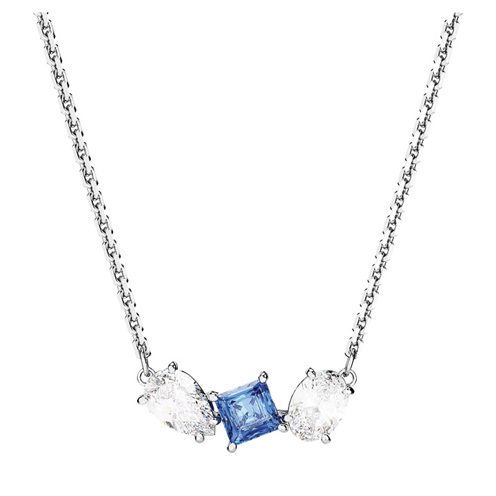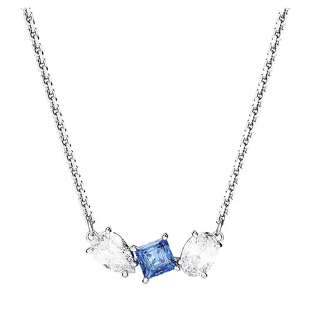 This elegant Mesmera pendant necklace from Swarovski delivers exquisite refinement through a bold mix of cuts and colors. Worn on a delicate chain, the rhodium-plated design features a trio of prong-set zirconia in varying shapes with a radiant blue central stone. It measures 48-45cm. long, with a 0.8 x 2cm. motif.
