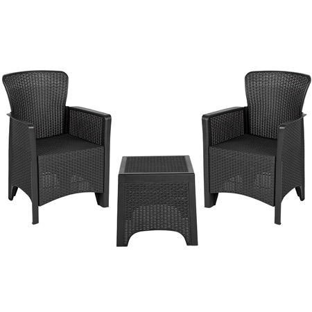 This three-piece dark gray faux rattan chair and side table set will fit any space. It includes two armchairs with a matching side table, and a durable resin frame that is lightweight and durable. The side table measures 15” square and holds up to 80 pounds. The chairs hold up to 330 pounds.