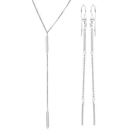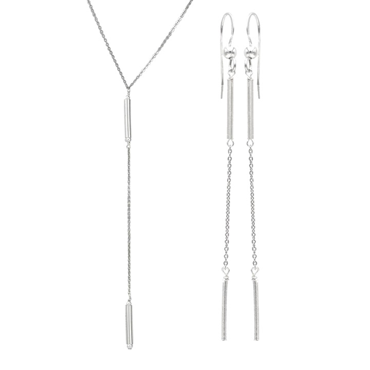 The “Double Date” vertical bar earrings and necklace from Antwerp are made of sterling silver, with two sleek sterling-silver bars that delicately hang from one another. This fashionable duo is the perfect jewelry to grab and wear every day, with a simple design that will match any outfit.