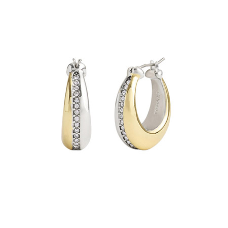 The sculpted, tubular huggie hoop earrings from Coach have a neutral two-tone finish adorned with delicate pavĂ© that’s perfect for everyday. The hoops have heart-shaped crystals with 8mm round faux pearl, and a titanium post for pierced ears. The hoops measure about 0.75” x 0.25” and come with a signature Coach jewelry pouch.