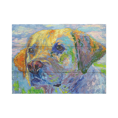 “Old Faithful” by Robert Blehert captures the essence of a local companion. The impressionist painting features a Labrador retriever, a popular breed known for its friendly demeanor and unwavering loyalty. With its vivid colors and masterful strokes, the piece brings a modern flair to a traditional subject; it’s printed on a custom-made wooden box and finished with a white painted edge. Measures 9” x 12”.