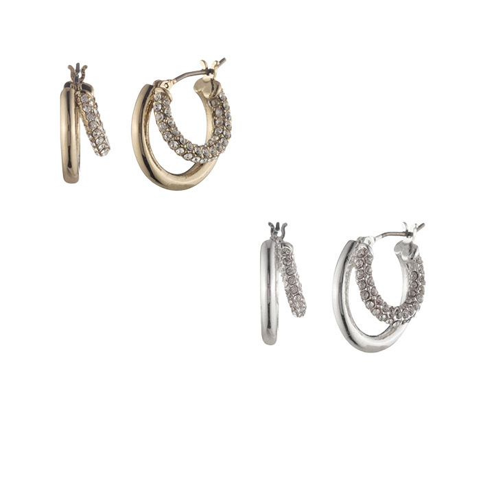 This two-piece set of split hoops from Polo Ralph Lauren is definitely on trend. Each pair of double hoops has a petite pave crystal hoop and a solid silver-tone or gold-tone hoop. The earrings are for pierced ears and have click-it closures. They measure 0.65” in diameter.