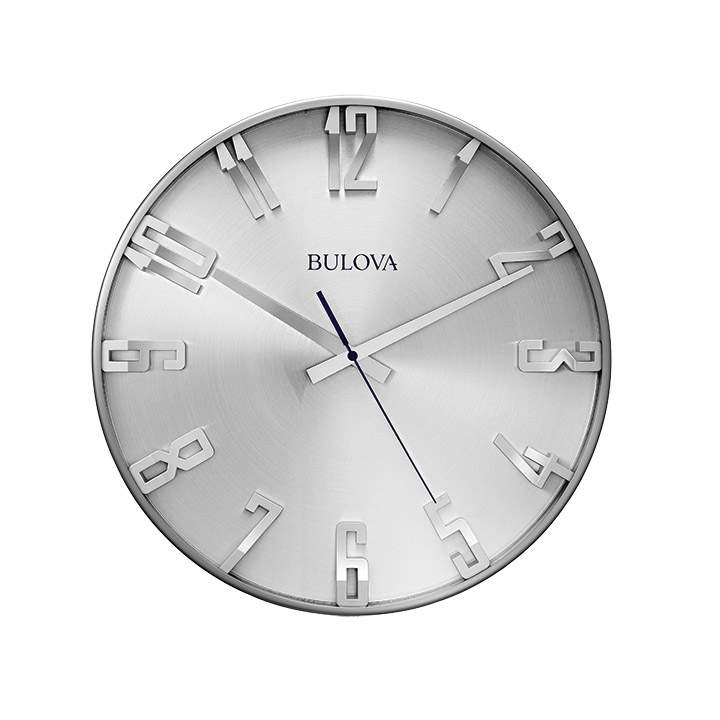 The Director wall clock from Bulova features a sleek, ultra-slimline metal case in satin pewter finish, tone-on-tone bold sculpted raised numerals, and a bright blue quiet-sweep second hand. The accurate quartz movement uses 1 AA battery (not included). Measures 16” in diameter, 1.8” deep.