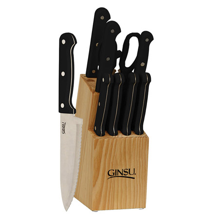 This 10-piece cutlery set from Ginsu features knives with serrated blades that perform as accurately as fine-edged professional cutlery and never need sharpening. The unique scalloped edge prevents the tearing of food like traditional serrated blades. Includes an 8” slicer, 6” chef’s knife, 4.5” utility knife, 4 4.5” steak knives, a 3.5” paring knife, kitchen shears, and storage block.
