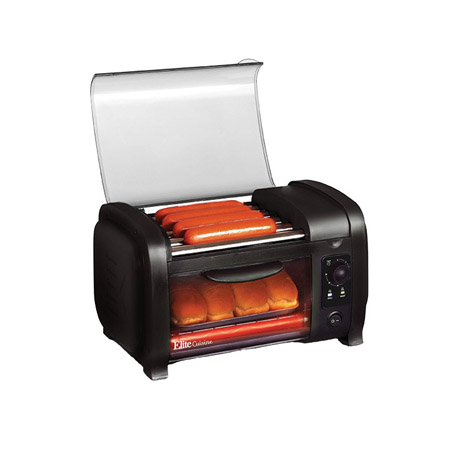 The hot dog roller toaster oven and bun warmer has five stainless-steel heated rollers, a 30-minute oven timer to keep rolls or buns warm and toasty, and an oil retaining tray that catches oil drippings from hot dogs or sausages. Measures 7.25” x 7.25” x 12”.