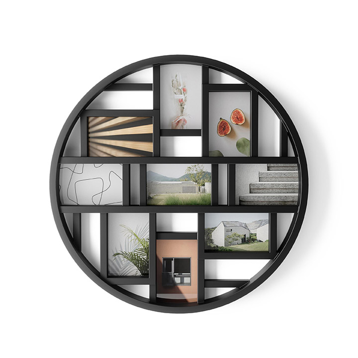 The Luna black photo/art wall display holds nine of your favorite 4” x 6” photos in a modern, gallery-style fashion and will effortlessly enhance your wall décor. Its practical design features a solid backing that will allow you to easily clean and change your images. It measures 23” in diameter and comes with two sawtooth hangers pre-mounted to the frame.
