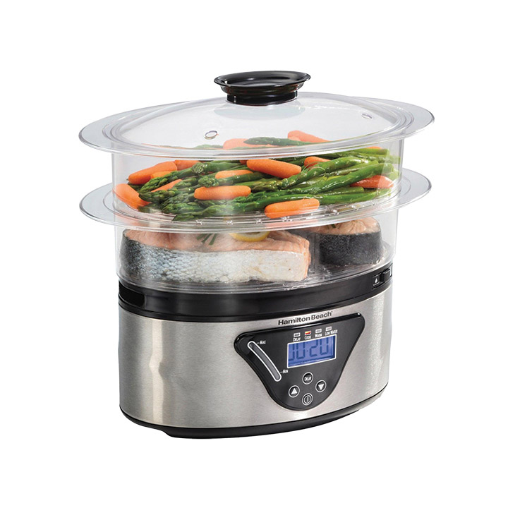 Easily steam healthy nutrient-rich vegetables, seafood, meats, and more without butter or oil thanks to this two-tier 5.5-quart digital food steamer from Hamilton Beach. The stackable clear bowls let you prepare a whole meal at once, with an easy-to-use digital touchpad with timer, keep warm, and delay start. Cleans and stores easily with nested parts.