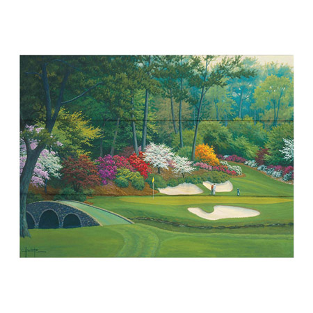 Enjoy the grace and beauty of Charles White’s “12th Hole at Augusta,” which depicts the famed Augusta National’s golf course in Georgia and is a must-have for any golf enthusiast or collector. The artwork is printed on a custom-made wooden box and finished with a white painted edge. Measures 9” x 12”.