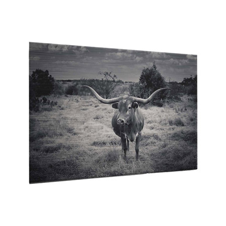 Immerse yourself in the majesty of the American West with this striking grayscale photograph by Kelly Wade. The image captures a magnificent Texas Longhorn bull in a pasture, using contrast techniques to accentuate the animals’ iconic horns and powerful presence. The art is printed on a Dibond aluminum metal plate and is designed for durability and clarity—even outside. Measures 8” x 12”.