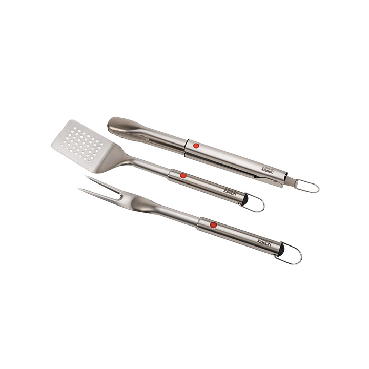 Utensil heads retract for compact storage. Durable stainless-steel construction. Tongs with lockable handles and teeth for precision grip. Slotted turner head allows grease and food juices to drain. Tools dismantle for easy-cleaning and feature hanging hooks for easy storage. Dishwasher safe.