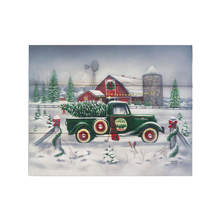 Embrace the magic of the holiday season with Rober Andrea’s painting, “Ye Olde Christmas Truck,” which will transport you to a picturesque wintry scene where a vintage truck makes its way through the snow-covered countryside. The artwork is printed on a custom-made wooden box and finished with a white painted edge. Measures 11” x 14”.