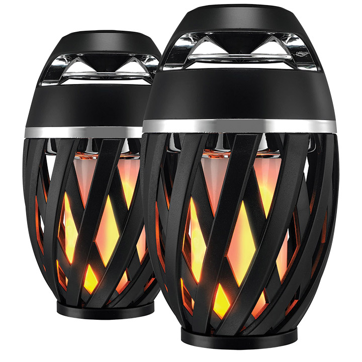 Bring the music and ambiance to your next backyard party with the iLive TiKi speaker patio bundle of two pairs. With realistic flickering flame effects, you can enjoy the look of a lantern glow without the mess. The speakers support TWS technology and Bluetooth v5.3 and have a wireless range of 59 feet to speaker, 33 feet between speakers. Battery life is about two hours at 100% volume with the lights on.