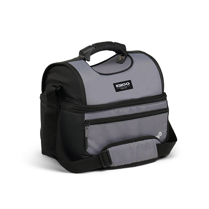 Advanced MaxCold insulation keeps food and drinks cold for longer. Exterior fabric made from 100% recycled polyester. Dual compartments for better separation and organization. Features multiple carry options: top handle and adjustable shoulder strap for crossbody. Coated exterior bottom panel provides extra protection for longer lasting use. Front zipper pocket for additional storage. Liner is antimicrobial totally wipeable and leak-resistant. Holds 16 cans. Dimensions: 10.5"L x 8.5"W x 11"H. Igloo 1-year limited warranty.