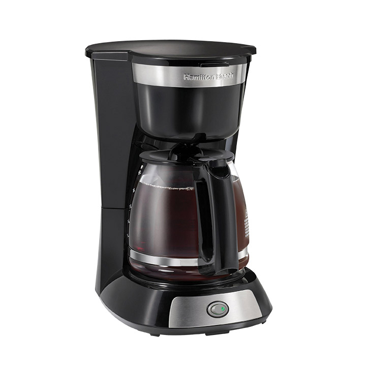 The Easy Brew 12-cup coffee maker from Hamilton Beach features easy one-button brewing with an illuminated on/off switch, an easy-fill water reservoir with a large front-view window, auto pause and pour, convenient cord storage, and an easy-to-clean nonstick warming plate. The borosilicate glass carafe and brew basket are dishwasher safe.