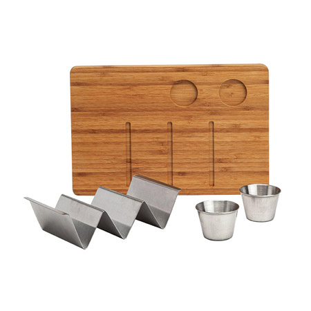 Bamboo taco board includes a 12” x 8” bamboo tray, a stainless-steel taco holder that keeps up to three tacos upright for easy serving, and two 2-ounce stainless-steel salsa cups for dips and toppings. This set is perfect for Taco Tuesdays, dinner parties, and casual entertaining.