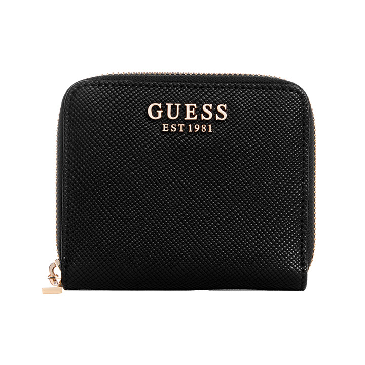 The Laurel small zip-around black wallet from Guess Handbags has front logo lettering, a zip-around closure, 4 card slots, 1 bill pocket, and 1 coin pocket. The wallet measures 4” x 4” x 1”.