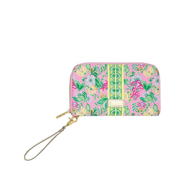 With a full patterned exterior and luxe gold interior, this chic Via Amore travel walled from Lilly Pulitzer gets you where you’re going in style. Inside, you’ll find 6 pockets and 2 flaps, and an outside pocket and zipper closure that keeps everything in its place. Measures 5” x 0.5” x 8”.