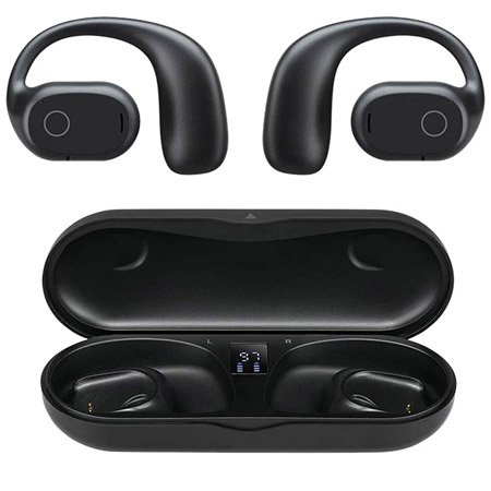 These clear Truly Wireless Bluetooth open-ear earbuds allow you to stay aware of your surroundings while offering full stereo sound and sweatproof design. The earbuds work with Siri and Google Assistant and have two built-in mics, flexible and secure silicone ear hooks, 16mm drivers for solid volume, a USB-C port for battery recharge, and a fully charged case that can recharge earbuds for 1.5-hour playtime in 20 minutes.