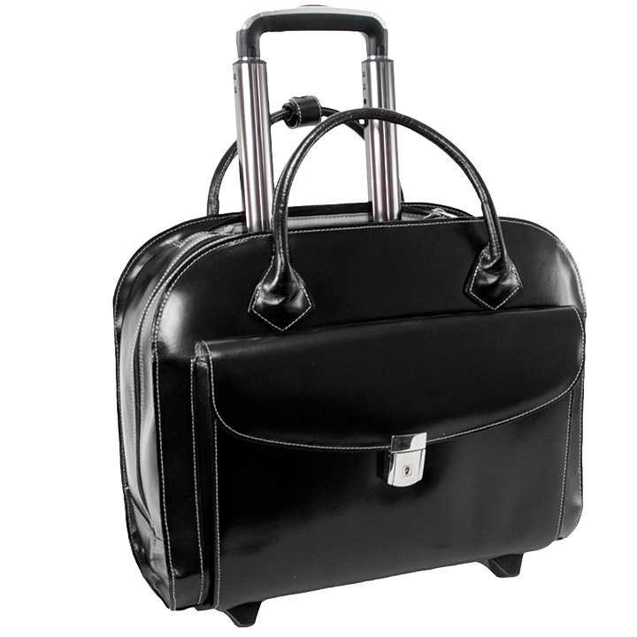 McKlein’s 15.6” wheeled women’s laptop case has a quick-access front pocket that’s secured with a key lock and an interior organizer with storage space for media devices, business cards, key holder and pens, with a double compartment that’s divided by a secured zipper pocket for important documents. A built-in high-density laptop compartment protects laptops up to 15.6” in size, and the tablet pocket has a hook and loop fastener. A smart attachment strap allows transport on extended hands of other rolling cases and luggage.
