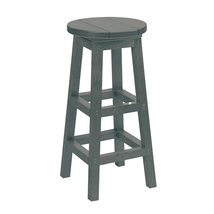This bar stool in slate grey is perfect for a casual get together with friends or hanging out with family. It is constructed of up to 100% recycled plastic and manufactured from heavy 7/8" gauge plastic lumber including stainless steel hardware, so its waterproof with no painting, slivers, or rot. Dimensions: 14" x 14" x 30". Weighs 21 pounds.
