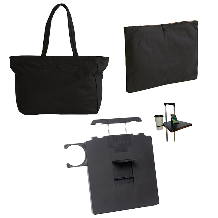 Take your desk with you on the go! The goDesk connects to your luggage handle and in just seconds you have instant desk space. It holds a full-sized laptop and features a device lock and cup holder, plus it stows easily in a luggage pocket.