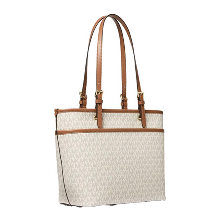 The Winston Tote from Michael Kors is made of pebble embossed leather with gold hardware and features a top zip closure, a back zip pocket, and 2 front zip pockets inside. Dimensions: 14" x 11" x 18". Weighs 2 pounds.