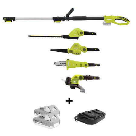 This cordless interchangeable multi-tool set includes a leaf blower, hedger, trimmer, and chainsaw for versatile yard work. It comes complete with batteries and a charger and its perfect for all of your outdoor tasks.