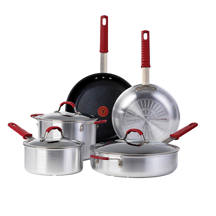 T-Fal's ultimate cookware series is designed for the everyday cook who wants to take their cooking to the next level. These pots and pans feature NSF and CBA certified body and T-Fal's platinum non-stick coating. The set includes 10" and 12" fry pans, 3-quart saucepan with lid, 5-quart jumbo cooker with lid, and 6-quart stock pot with lid.