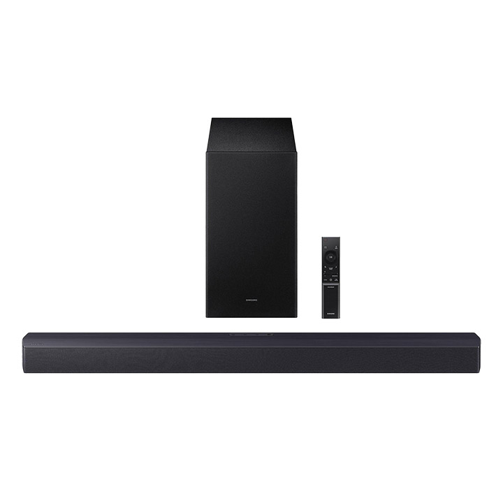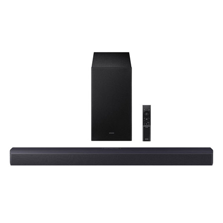 2.1 channel sound offers deep and rich bass that fills any space in this B-series Soundbar from Samsung. It can connect via Bluetooth, HDMI ARC, HDMI out, Optical In, and USB music playback. And features adaptive sound, voice enhance mode, night mode, and game mode.