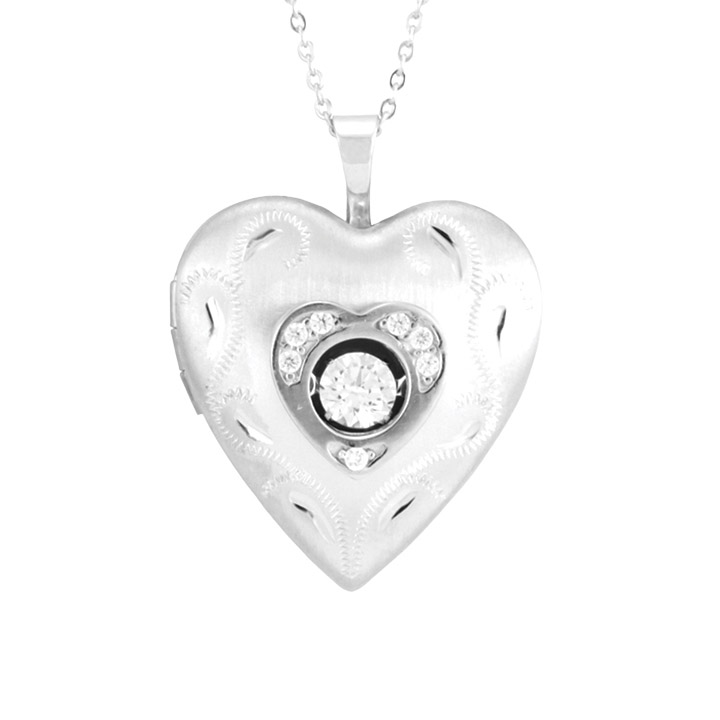 This Antwerp Shimmering heart necklace is a perfect way to show your love. The glistening, rotating heart pendant is made of sterling silver, and each piece is adorned with a single 1-carat round cubic zirconia, and each cubic zirconia is hand-set by master craftsmen. The pendant is suspended from a sterling-silver 16” chain.