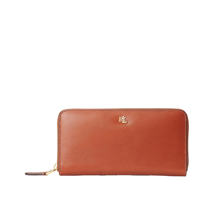 Artfully crafted from buttery smooth leather, this tan continental zip wallet from Polo Ralph Lauren offers ample room for cards, receipts, and other essentials. It has a zip closure, nine credit card slots, two slip pockets, and one interior zip pocket. The wallet has a polished “LRL” metal logo at the front. Measures 4” x 8” x 1”.