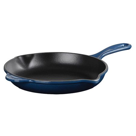 The 9” signature cast-iron skillet in Ink from Le Creuset has a durable enamel finish for even heat distribution and superior heat retention, with exterior enamel that resists chipping and cracking. The black sating interior is specially formulated for higher surface temperatures. It’s lightweight and safe for all stovetops, including induction. Measures 15.75” x 1.75” x 9”. Dishwasher safe.