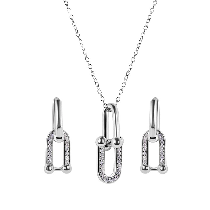 This chic, smart bow paperclip set features a round bow paperclip cubic zirconia necklace and hoop earrings. The pieces are crafted of 925 sterling silver set in rhodium plating with pave-set CZ. The pendant measures 8.4mm x 21mm while the earrings measure 11.8mm x 23.4mm, and the adjustable chain measures 16”-18”.
