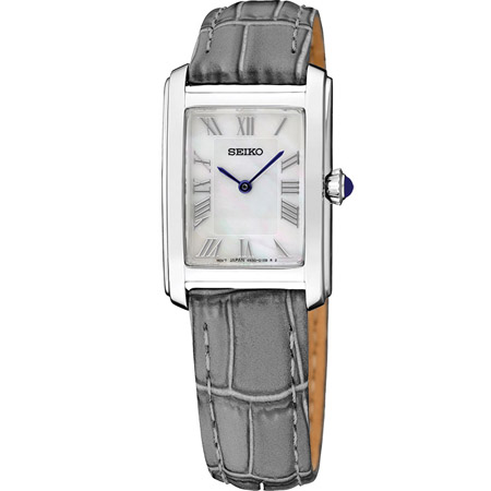 From Seiko’s Essentials collection, this watch is a contemporary classic, beautifully proportioned for a streamlined feel with a white mother of pearl Roman numeral dial, blue hands, and a blue cabochon crown. The watch has a sleek rectangular 22.2mm stainless-steel case and soft blue-gray calf leather strap for comfort and style.