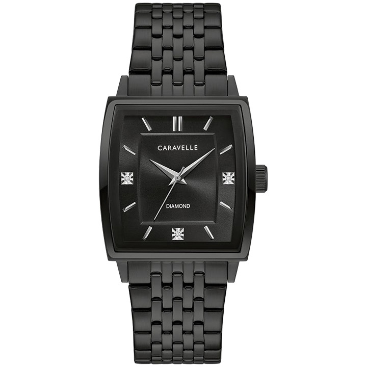 Contemporary design imbues this Caravelle men’s watch with a forward-looking aesthetic, with a black-tone stainless-steel case that features a metallized curved mineral crystal. It’s appointed with applied silver-tone hour markers and matching hands, with a tiered sunray black dial that’s enhanced by three diamonds and a black-tone stainless-steel bracelet with a folding push-button closure. The case measures 33mm x 44mm. Water resistant to 30M.