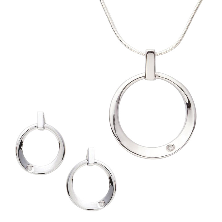 This diamond earring and necklace set features urban style and diamond dazzle to celebrate the circle of a life well-lived. The pieces feature .04 total carats of round diamonds set in sterling silver circles, and the pendant hangs from an 18” round snake chain.
