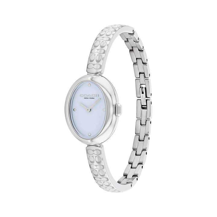 This women’s Sammy watch from Coach is refined for everyday looks. It has a silver-tone stainless-steel thin bracelet adorned with the “C” logo print, a pale blue oval dial with silver hour markers and two hands, and the Coach logo below the 12:00 position. The case measures 22.5mm and has a mineral crystal dial window. Water resistant to 30M.
