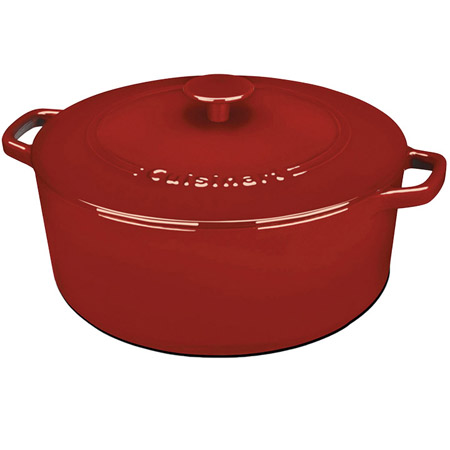 The Cuisinart Chef’s Classic enameled cast-iron 7-quart round covered casserole, in cardinal red, provides superior heat retention and even heat distribution for perfect results every time. The cast-iron provides exceptional quality and easy cleaning, and the porcelain enamel doesn’t absorb odors. It’s excellent for cooking, serving, and entertaining. Measures 12” x 5.75” x 12”.