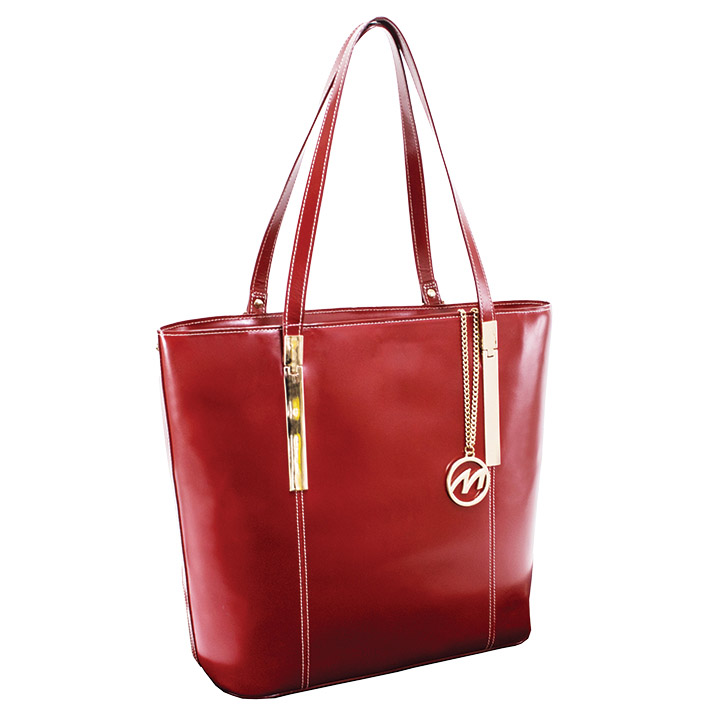 McKlein’s vibrant red leather shoulder tote has an elegant gold key chain, exposed zipper, easy-access exterior back pocket, and a fully lined interior compartment with multiple pockets. It has a black and white paisley lining and gold-studded feet for stronger stability.