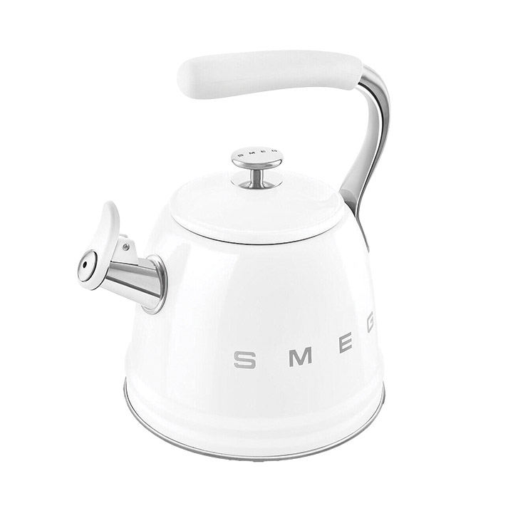 The Smeg 50’s retro-style whistling kettle is a contemporary tea kettle that is built to stand the test of time. It has steel handles with silicone grip, single-tone whistle with drip-free spout, interior max fill line, and a removable lid for easy cleaning. The kettle has a 2.4-quart capacity.