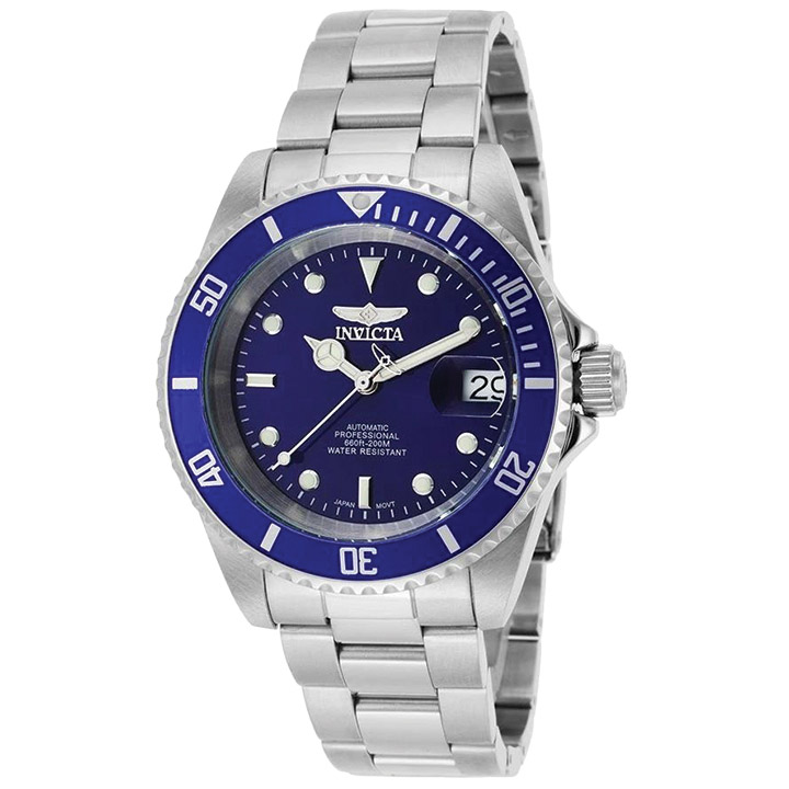 This men’s pro diver automatic watch from Invicta Watches features precise Japanese automatic movement, a coin-edge bezel, and a magnified date window on a blue sunray dial. The watch also features mineral crystal, a stainless-steel 40mm case and bracelet, luminosity, a unidirectional bezel with blue top ring, and exhibition case back. Water resistant to 660 feet.