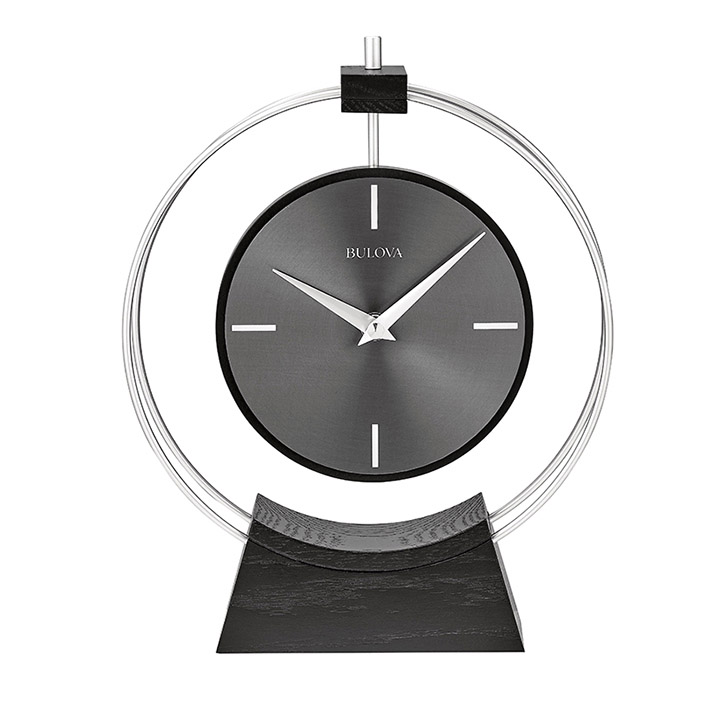 This clock's modern “floating” dial design is framed by dual ringed silver finished tubes for a unique, stunning timepiece. The black floating dial can be rotated left or right to improve sight and has silver hour markers at the 12, 3, 6 and 9 positions. Solid oak wooden base in a black washed finish.